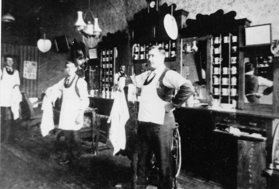 this barbershop. Photo may be more accurately dated based on a sale deed. Front chair: co-owner Irving L. Patrick, b.9/9/1876; d.10/29/1936.