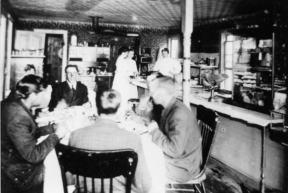 George Leroy Carmack (b.4/9/1895 Hartington, NE; d.2/21/1987 Billings, MT) seated at rear table (facing camera).