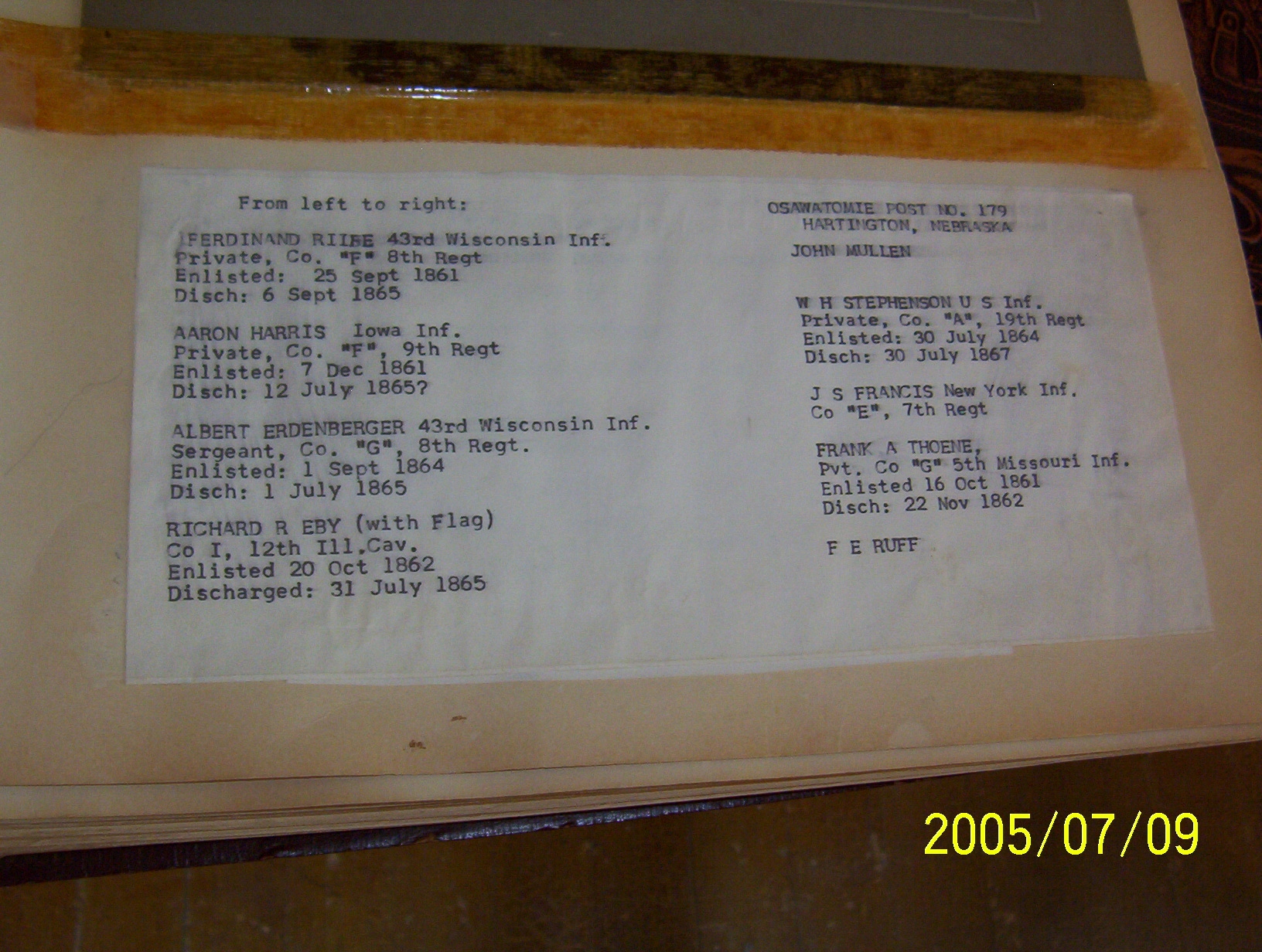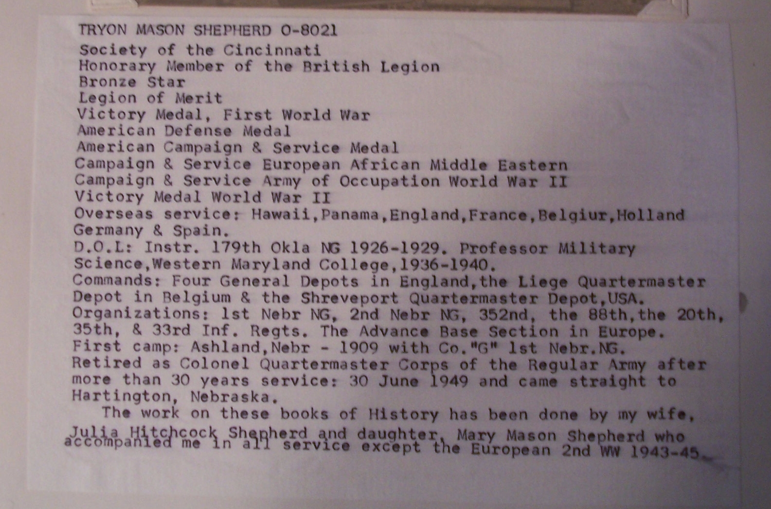 CIVIL WAR GAR Boyz in Blue of 1863 (Photo) Hartington, NE. Photo by Wickland. Taken 5/30/1908. GAR Boyz in Blue of 1863 (Identification) Hartington, NE. Photo by Wickland. Taken 5/30/1908. CAVE James J., Judge GYTE William OLSEN Bernhart Claus WISEMAN Henson WISEMAN John C. Submitted by Carol Tramp DICKINSON William Louis DICKINSON William Louis, War Record DICKINSON William Louis, War Record Submitted by Paul Nickens SPANISH AMERICAN WAR FERBER Harry H. TELLESEN Charles C. Submitted by Carol Tramp WORLD WAR I SHEPHERD Capt. Tryon Mason STOCKWELL Harry A. Submitted by T.H. Rossiter WORLD WAR II BURNEY Kip BURNEY Willard STOCKWELL James A. & John H., sons of Harry Stockwell Submitted by T.H. Rossiter WORLD WAR I & WORLD WAR II SHEPHERD Col. Tryon, receiving Bronze Star SHEPHERD Col. Tryon Mason, war record Submitted by T.H. Rossiter |