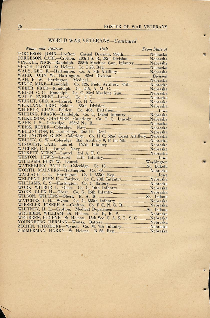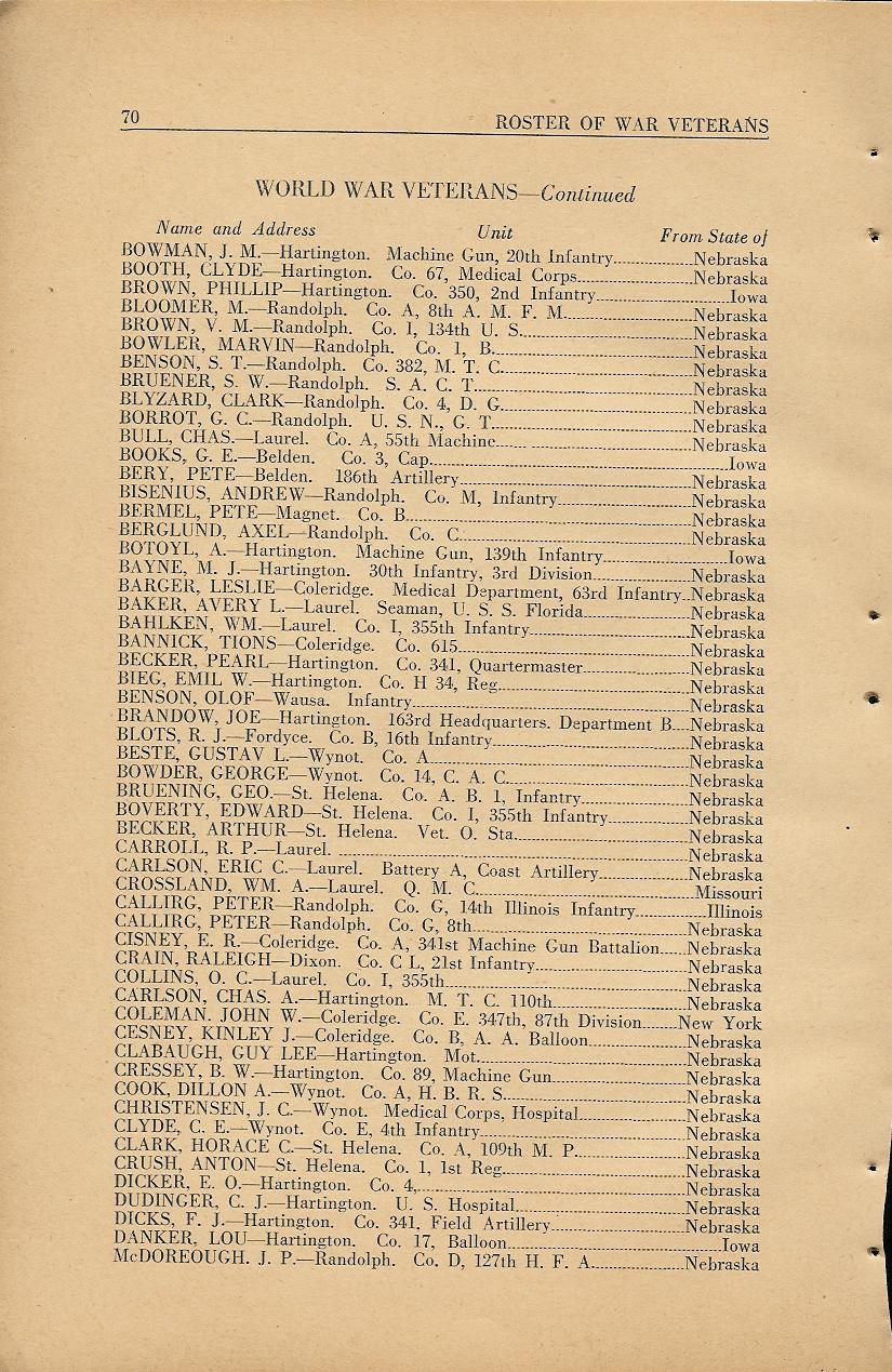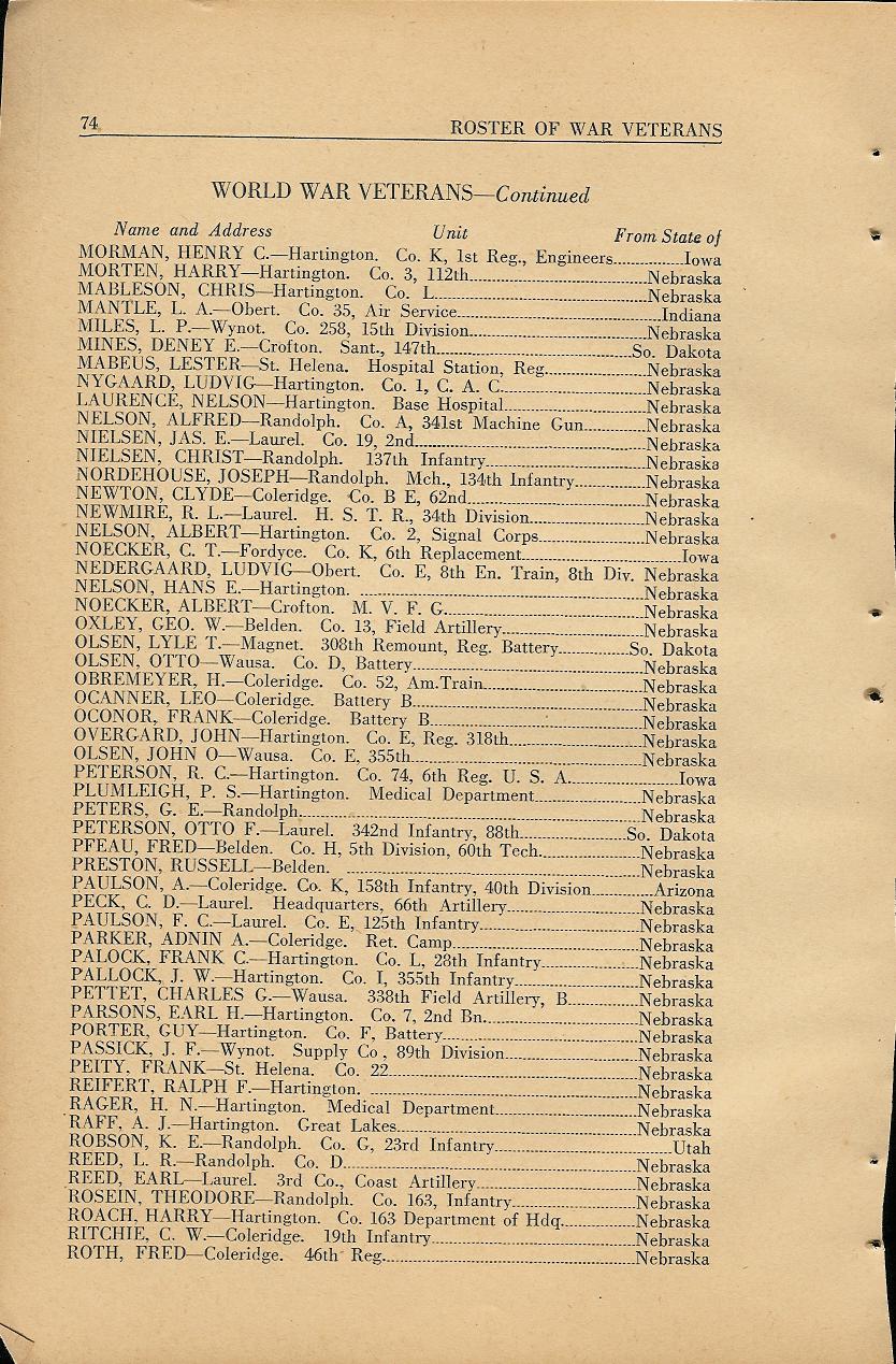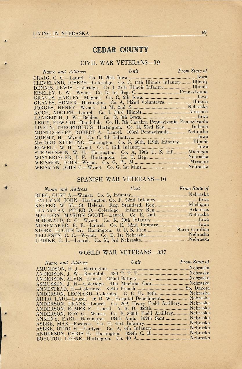 who Served in the War of the Rebellion, Spanish-American War and World War, ©1925 Cedar County, Nebraska Cover Page Publication Page Forward Page 69 Civil War Veterans; Spanish-American War Veterans; World War Veterans Page 70 World War Veterans Page 71 World War Veterans Page 72 World War Veterans Page 73 World War Veterans Page 74 World War Veterans Page 75 World War Veterans Page 76 World War Veterans |