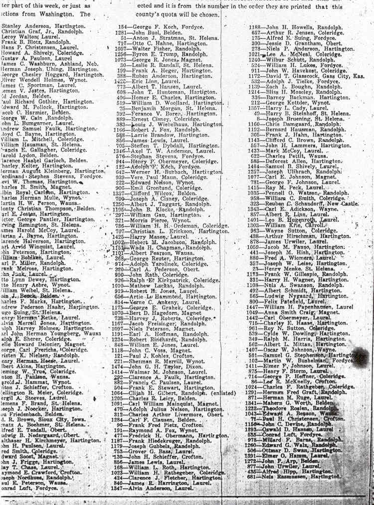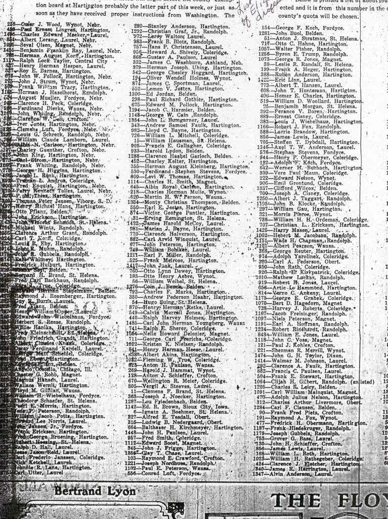of Cedar County, Nebraska World War I List of WW1 Eligible Draftees from Cedar County Cedar County News, July 26, 1917 List of WW1 Eligible Draftees from Cedar County - Page 2 Cedar County News, July 26, 1917 VETERANS AAGAARD Peter A. ADAMS Robert, Randolph AILLO Laui, Laurel ALDERSON Leonard C., Belden AMUNDSON H.J., Hartington ANDRUS Truman, Coleridge ANDERSON Alfred, Laurel ANDERSON Alfred, Obert ANDERSON Alvin, Laurel ANDERSON Charles, Obert ANDERSON Chris H., Hartington ANDERSON E.W., Randolph ANDERSON Elmer F., Laurel ANDERSON Frank, Laurel ANDERSON J.W., Randolph ANDERSON Jess, Randolph [Same as J.W. above?] ANDERSON Leonard, Coleridge ANDERSON Lykke, Belden ANDERSON Robert, Laurel ANDERSON Robert, So. Sioux City ANDERSON Stanley A., Paragon ANDRUS Leonard ANKENY Earl, Hartington ANNESTEAD H., Coleridge ASBRE Marcellinus, Constance ASBRE Max, Fordyce ASBRE Otto H., Fordyce ASMUSSEN J.H., Coleridge BAHLKEN William, Laurel BAKER, Avery L., Laurel BANNICK Tions, Coleridge BARGER Leslie, Coleridge BARKS G.E., Belden BAYNE Marion J., Hartington BAYNE Martin, Coleridge/Lawn Ridge BECKER Arthur, St. Helena (Catholic) BECKER Marcus, St. Helena (Catholic) BECKER Pearl, Hartington BENJAMIN John, Wayne BENSEN F.S., Randolph (St. Frances) BENSON S.T., Randolph BERGLUND Axel, Randolph BERMEL Peter, Magnet BERY Pete, Belden BESTE Gustav L., Wynot BIEG Emil W., Hartington BIEHLE Herman, Belden BISENIUS Andrew, Randolph BLOOM Adolph, Concord BLOOMER Myron, Randolph BLOTS R.J., Fordyce BLYZARD Clark, Randolph BOOKS G.E., Belden BOOTH Clyde, Hartington BORROT G.C., Randolph BOTOYL A., Hartington BOTTOLFSON Bernhard M., Private BOUGHN Kenneth, Randolph BOVERTY Edward, St. Helena BOWDER George, Wynot BOWLER Marvin, Randolph BOWMAN J.M., Hartington BOYUTOU Leone, Hartington BRAND Bernard, St. Helena (Catholic) BRANDOW Joe, Hartington BRENNEMAN Perry, Concord BRESSLER Harry, Coleridge BRINDLEY Fred, Randolph BROWN Phillip, Hartington BROWN V. Milo, Randolph BRUENER S.W., Randolph BRUENING Geo., St. Helena BRUENING Leo, St. Helena (Catholic) BONERTZ Edward, St. Helena (Catholic) BULL Chas., Laurel BUOL George, Randolph BUOL Paul, Randolph BUMGARNER John, Laurel BURREO Charles, Laurel BURRUS Charles, Obert CALLIRG Peter, Randolph CALLIRG Peter, Randolph CARLSON Chas. A., Hartington CARLSON Eric C., Laurel CARROLL R.P., Laurel CARROLL Dr. Robert, Blair CESNEY Kinley J., Coleridge CHASE Floyd, Belden CHRISTENSEN J.C., Wynot CISNEY E.R., Coleridge CLABAUGH Guy Lee, Hartington CLARK Horace C., St. Helena CLYDE C.E., Wynot COBURN Darrell, Laurel COLEMAN John W., Coleridge COLLINS Oscar C., Laurel COOK Albert, Laurel COOK Dillon A., Wynot CRAIG Aura, Randolph CRESSEY B.W., Hartington CROSS Ray, Laurel CROSSLAND William A., Laurel CRUSH Anton, St. Helena CURLEY Keith, Concord DANKER Lou, Hartington (Laurel? Died: 1952)) DELOZIER Howard, Magnet DENDINGER Cyril, Hartington DEWEY Irwin DEWEY Otto DICKER E.O., Hartington DICKES Frank, Hartington DICKS F.J., Hartington DODSON William, Magnet DRESDEN Martin, Hartington DUDINGER C.J., Hartington DURRIE Howard, Laurel EBMEIER Alois, Coleridge ECHTENKAMP Harry, Belden EICKOFF Frank, Fordyce ERICSON Clarence, Laurel ESKINS Martin, Hartington FARNEY Ray, Laurel FARREN Thomas, Randolph FEELHAVER Oscar, Paragon FILBEN Delbert, Randolph FINN Michael, Randolph (St. Frances) FLAGHERTY Raymond, Dixon FLYNN P.J. FORSBERG Emil, Laurel FOSTER George, Hartington FRANS Charles Ernest, Belden FRERICHS Edward FRIGGE John, Bow Valley FROST James, Randolph GARDNER Ned, Randolph GARRISON Charles, Belden GARTNER Edward, Coleridge GIBSON L.S., Randolph GLEASON R.B.F., Randolph GOETZ Charles, Hartington GRAF Christian, Belden GRAFFIS Elmer, Laurel GRAVERHOLT Chris, Laurel GRAY Earl, Wynot GREINER Nickolas, Randolph (St. Frances) GRIESEL Daniel, Belden GRIFFIN W.M., Laurel GUBBELS Joseph, Randolph (St. Frances) GUBBELS Louis, Randolph (St. Frances) HALVERSON Clarence, Obert HAISCH William, Laurel HANSEN Jens, Laurel HASH John HASKELL C.D., Wakefield HASSMAN Benjamin, Randolph (St. Frances) HAUSMAN William, St. Helena (Catholic) HAVORKA V.C., Randolph (St. Frances) HEFTI Robert, Coleridge HEIDERMAN Henry, Randolph HENRY Lloyd A., Coleridge HERMAN Frank, Randolph HESSE Edward, Hartington HICKEY Rudolph, Randolph HOEPNER Robert, Randolph HORAN Charles HUGHES C.W., Randolph HUNTER Loran INGHAM Ralph IRLE Sylvester, Bow Valley JACOBS Paul, Wynot JACOBSON Elert, Belden JANSSEN Carl JENKINS Cecil JENSEN Chester, Coleridge JENSEN Chris, Laurel JENSEN Chris, Winside JENSEN Jens, Laurel JOHNSON George, Laurel JOHNSON Gilbert, Laurel JOHNSON Wendell, Laurel JONES Evan, Randolph JONES Richard, Magnet JORDAN Lester, Belden JOSSI Albert, Randolph (Belden?) KALIN Stephen, Coleridge (St. Michaels) KARDELL Oscar, Concord KASTRUP Viggo, Laurel KENNY Benis, Randolph (St. Frances) KLANDERUD Olof, Hartington KLEINBURG Phillip, Wynot KLUG Stephen, St. Helena (Catholic) KOESTER Frank KOHLES Frank, Menominee KOLLARS Frank, Aten KOOB John, Randolph KORBACHER Henry, Laurel KORBACHER John, Laurel KORFF Carl KORTH Henry, Randolph (St. Frances) KOSTER Frank, Coleridge KREIGER R.J., Randolph (St. Frances) KRUSE Louis, Randolph LAKE Merton, Laurel LAMMERS George, Hartington LANGE Louis, Bow Valley LANGE Louis, Coleridge (St. Michaels) LARSON Albert, Randolph LARSON Algott, Laurel LAUER John, Hartington LEAPLEY Orval, Coleridge LECLAIR A.E., Randolph (St. Frances) LEITING Frank, Randolph (St. Frances) LEITING Joseph, Randolph (St. Frances) LINDQUIST Vernon, Laurel LINN Gilbert, Wayne LORANG Albert, Laurel LUKES William, Laurel LUX Anthony LUX Hubert, Coleridge (St. Michaels) LYONS August, Laurel LYONS Irvin, Laurel MACKLEM Harold, Laurel MALONEY Clement, Laurel MASON Harry, Laurel MATTINGLY William, Randolph MAUN Vere, Castelton WY MAXON Floyd, Laurel MAYDEN Chester, Randolph MCCAW Elmer, Laurel MCDOREOUGH J.P., Randolph MCELHANEY Lloyd, Laurel MEIER Wellington, Coleridge MENG Rasmus, St. Helena (Public) MIDDLETON J.W., Ra