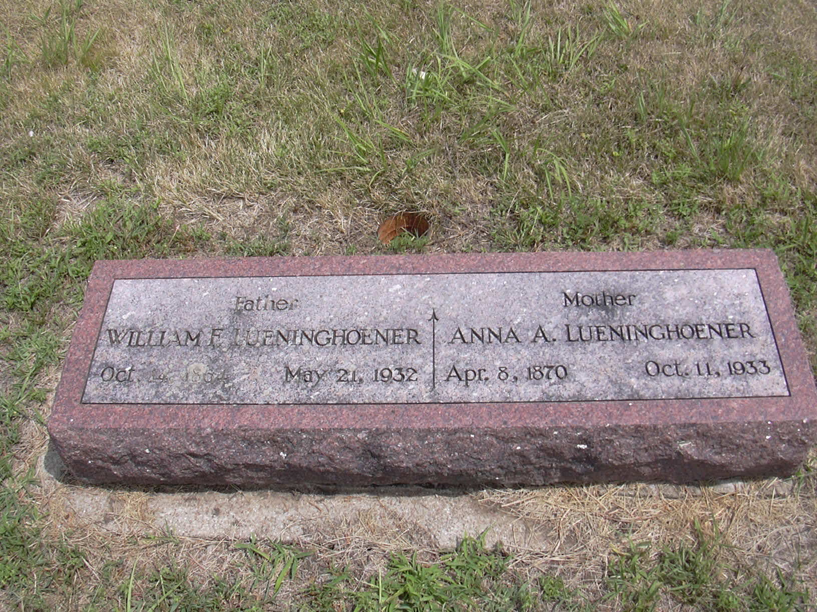 | Anna A. Lueninghoener | 8 Apr 1870 | 11 Oct 1933 | William F. Lueninghoener | ||