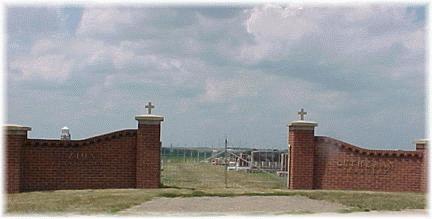 The cemetery is located south of the church on the west side of the road.