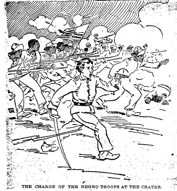 As we neared the rebel intrenchments a change of direction of the head of the column to the right brought us directly in front of the enemy's line, and then came the order, "By the left flank, March!" and over the breastworks clambered the dusky warriors, officers vieing with the men as to who should first be inside of the rebel works. The abatis made but little impression, even the breastworks made but a short pause, and the negroes were in a hand to hand fight with as good troops as the Confederacy had ever mustered. The black faces assumed an ashy hue, the eyes glared like those of wild animals, the lips were tightly drawn, showing the white teeth, and the expression on every face was terrible to behold as over the works we went. "Surrender! Surrender! Surrender!" was heard on every side, and those who defiantly refused were given the cold steel without mercy. For 18 months I had served in "Upton's Regulars" in the fighting Sixth Corps. I had been at South Mountain, Antietam, Fredericksburg, Salem Church and Gettysburg, but never had seen "lovelier fighting," as Phil Kearny would say, than this at the battle of the Mine. Well do I remember the Confederate Captain who while vainly trying to hold his command to their work kept yelling, "Kill 'em!" "Shoot 'em!" "Kill the damned niggers!" but while endeavoring to help carry out his own commands a bayonet in the hands of a dusky opponent as brave as he, pierced him thru and thru.