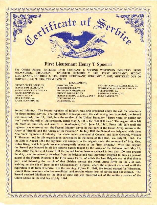 Military Service - 7 Oct 1861: Enlisted in Co. K. 2nd Wisconsin Infantry as 1st Sergeant. Promoted to 1st Lieutenant, Co. A, 2nd WI Infantry. 30 Jun 1864: Discharged, served 2y 8m 23d. Physical description: 5 feet 8 & 1/2 inches tall, wt 190 pounds; rheumatism in left knee, left arm and shoulder; injury to his left ankle incured in a fall from a scaffold while building house.