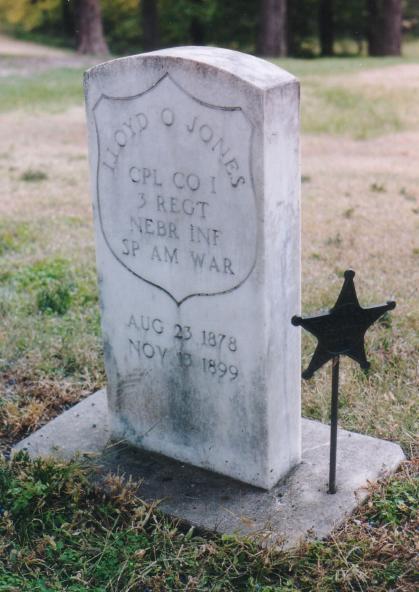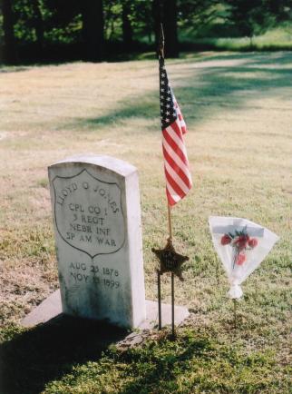Lloyd O Jones, Ravenna, Nebraska. He did of appendicitis a few months after he returned home. (Note: the marker next to head stone is mistakenly a Civil War marker) Photo by Val Vierk