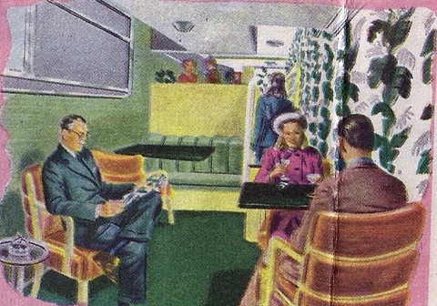 For friendly relaxation, there are 2 cocktail lounges furnished much like their counterparts in the smart supper clubs. There is a writing desk in a semi-private nook; telephone service is available to your home or business. The rear observation compartment affords a magnificent view of the swiftly changing landscape, through wide picture windows. Here, as everywhere else on the Train of Tomorrow, nothing has been overlooked that might contribute toward your enjoyment of the trip.