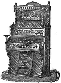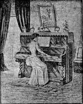 Represented below is an exquisitely beautiful piano, and when placed in the parIor and ornamented with the embroidered scarf, the silk plush stool, and large instruction book, it makes an outfit as beautiful and pleasing as it is complete. THE TONE OF THIS INSTRUMENT IS REMARKABLY SWEET AND SYMPATHETIC.