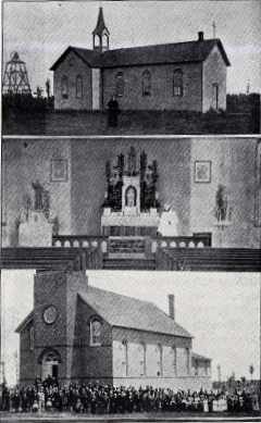 "St. Mary's was a structure that well might have been a barn. Its dimensions were 25x40 feet and it was commenced by John P. Braun and completed by Mr. Glassbrenner. The building was unplastered and nail kegs formed the support of the boards that served as seats. The altar had been made from the pieces of wash board left over. On the altar stood a brass crucifix, and the footends of two broken kerosene lamps served as candlesticks. A white cloth lay on the altar. That was all".