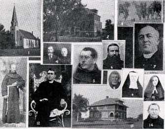 (1) Presentation B. V. M. Church, (2) St. Mary's School and High School, (2) The Ebel Farm, where Mass was said by Rev. Uhing, 1874, (4) Mr. and Mrs. Morbach, (5) Rev. Boniface Depmann, O. F. M., (6) Rev. John Gafron. O. F. M., (7) Rev. John J. Hoffman, (8) Rev. John Mueller, (9) Ven. S. Catherine, Ursuline, (10) Ven. S. Fulgentia Frisch, O. S. F.; (11) Rev. Ambrose Janssen, O. F. M., (12) Rev. Chas. Stapf, (13) St. Mary's Parsonage, (14) Rev. Seraphin Lampe.