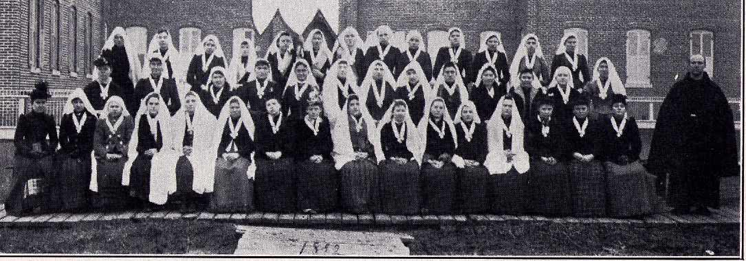 Anna Dischner, Sister Cresentia, O, S. F., died in Denver, buried in Columbus; Ella Byrnes (Mrs. Matthews of St. Louis); Agnes Fitzpatrick (Mrs. John J. Murphy, now Great Falls, Mont.); Lena Gietzen, Mrs. John Byrnes died, later he married her sister; Sara Fitzpatrick, died in spring of 1914, president of Sodality several times; Minnie Dischner, married O'Callahan, died a year or two ago; Lydia McMahon; Mary (or Tillie) Kukla; Charlotte Blanford, Sr. Polycarpa, O, S, F., now in Denver; Sara Blanford, also a Sister O, S, F.; Theresa Lebig, Mrs. Ripp Spaulding; Mary Adamy, Mrs. Hembd; Mary Lebig, Mrs. Dischner (Omaha).
