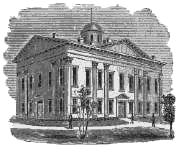 OMAHA MADE THE CAPITAL OF THE TERRITORY.--Acting Governor Cuming having designated Omaha as the place for holding the first Territorial Legislature, that body met in the old State House, on Ninth street, on the 16th day of January, 1855. The session lasted till the 17th day of March following. It being the duty of the first Leglstature [sic] to locate the Capitol, the greater part of the session was taken up with this important question; and excitement ran at fever heat all the time the Capitol contest was being fought. The contestants for the prize were Omaha, Fontenelle, Florence, Bellevue, Plattsmouth, Nebraska City, Brownville, and several other towns south of the Platte; but Omaha finally came out victorious.. The joint resolution locating the Capitol at Omaha was passed February 22, 1855.