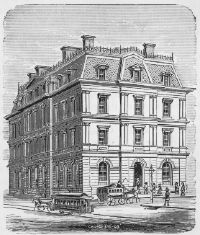 The Postoffice, fronting on Fifteenth and Dodge streets, completed in 1873, is one of the handsomest Government buildings in the country. It is built of a fine free stone from Ohio, is four stories high, occupying two lots, and cost, with the furniture, $450,000. The first floor is occupied exclusively by the postoffice, and the upper floors by the United States Courts and Government officers, while the basement is fitted up as a prison, with quarters for janitor and attendants.