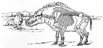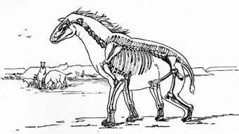 MOROPUS, A STRANGE, CLAWED, HERBIVOROUS ANIMAL 12 FEET IN HEIGHT. IT HAS A HORSELIKE HEAD AND NECK, BUT A RHINOCEROS-LIKE BODY. THIS WAS THE FIRST COMPLETE RESTORATION MADE OF MOROPUS SINCE THE SKULL WAS THE FIRST ONE FOUND. COLLECTIONS OF CHARLES H. MORRILL, NEBRASKA STATE MUSEUM.