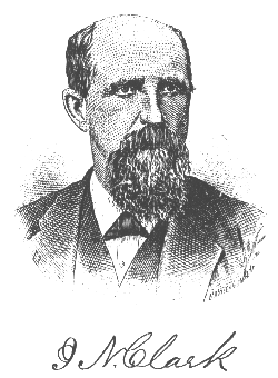 Part 2: County Seat Contests | Official Roster | County Buildings Railroads | County Associations Part 3: Storms and Other Calamities | Statistics of Progress Harvard: Early History | Corporation Part 4: Harvard (cont.): Official Roster | Educational | Religious The Press | Post Office | Fires | Lodges and Societies Part 5: Harvard (cont.): Hotels | Banks | Manufacturing Biographical Sketches Part 6: Sutton: Population | Buildings | The Railroad War Part 7: Sutton (cont.): Clark's Square | Official Roster Educational | Religious | The Press | Post Office Part 8: Sutton (cont.): Orders and Societies | Hotels | Banks Professional | Manufactories | Progress Part 9: Sutton (cont.): Biographical Part 10: Edgar: Incorporation | Educational | Religious | The Press Post Office | Societies | Hotels | Banks Biographical Sketches Part 11: Edgar (cont.): Biographical Sketches (cont.) Fairfield: Incorporation | Educational | Religious Part 12: Fairfield (cont.): The Press | Post Office Lodges and Societies | Hotels | Banks | Progress Biographical Sketches Part 13: Clay Center: Biographical Sketches Glenville: Biographical Sketches Sheridan Precinct: Biographical Sketch Other Towns List of Illustrations in Clay County Chapter JOHN E. BAGLEY, attorney at law, was born in Richland, Keokuk County, Iowa, October, 1848, and was reared on a farm. In 1871, he began the study of law in the office of E. Odell, at McGregor, Iowa, following it off and on for several years. He came to Nebraska in the spring of 1874; resided for a few months at Falls City, Richardson County, during which period he studied law with A. J. Weaver, District Judge, and was admitted to practice at the bar in May 1874, at Pawnee City, Neb. He came to Sutton September 2, that year, and began the practice of this profession, and on November 1, 1875; became associated with George W. Bemis, under the style of Bagley & Bemis, which firm still conducts a law office at this place. Mr. Bagley was elected Chairman of the Board of Trustees of Sutton in April, 1881, and Chairman of the School Board in 1880, and re-elected in 1881. He was married in Scott County, Iowa, July 10, 1871, to Rose Anna Johnson, a native of Iowa. They have four children--Horace B., Blanche, Minnie and one infant daughter. GEORGE W. BEMIS, of the firm of Bagley & Bemis, attorneys at law, was born in Mayfield, Fulton County, N. Y., September 1, 1846; removed to Cedar Rapids, Iowa, at seventeen, and engaged as salesman in hardware for two years, and was Deputy Postmaster at that place for one year; afterward followed merchandising at Marion and Belle Plaine, until he came to Sutton in May, 1871, being among the first to settle in that then wilderness. He homesteaded eighty-one acres on the town site section of Sutton, which he still owns and has finely improved. His village residence appears on page-- (image). He studied law with Col. H. W. Gray, and was admitted to practice in the spring of 1874, and rose rapidly to a large and lucrative practice, being in 1876 appointed City Attorney, and in that capacity drew the first ordinance ever passed in the city. In May, 1882, he defended and cleared A. M. Anderson of the murder of John Johnson, a case of great notoriety in Clay County, Neb., his effort in that behalf being admittedly the most ingenious and able ever made in the county. He has been a partner with John E. Bagley for seven years past. Mr. Bemis was married at Marion, Iowa, January 1, 1868, to Ada A. Gray; they have four children--Albert L., George W., Jr., Anna and Eugene. [RESIDENCE OF ISAAC N. CLARK.] [Portrait of I. N. CLARK.] ISAAC N. CLARK was born at Parma, near Cleveland, Ohio, June 18, 1836. At the age of three years, he learned his first lessons in one of the log schoolhouses of that new country. At the age of ten years, he assisted his father on the farm. From the age of fourteen to twenty years, his winters were spent at school, either at Brooklyn Academy or Baldwin University, Berea. At the age of twenty-one, he went to Hiram College, Ohio, to attend a Teachers' Institute, and there received a certificate to teach school from James A. Garfield, then President of that college and School Superintendent of that county. The following winter he taught in his native town. The following spring he went to Jefferson County, Mo., procured the school at Blackwell Station and taught until October; then went to Champaign County, Ill., and engaged in farming until the war of the rebellion. He enlisted with the Illinois volunteers, on the 4th day of June, 1861; he was soon after ordered to St. Louis and mustered into Company G, Twenty-fifth Regiment Illinois Volunteer Infantry. He was appointed a Corporal and stationed at the United States Arsenal, to guard rebel prisoners confined there, until September, when, from camp exposure, he took inflammation of the eyes, and was sent to the hospital, near Carondelet, Mo., and, after weeks of suffering. this terminated in ulceration of the left eye; was transferred to the Sisters of Charity Hospital, Pine street, St. Louis, and though the best of medical skill was provided, the disease resulted in a permanent opacity, for which he was honorably discharged on the 4th day of October, 1861. For this disability he has received a pension. In September, 1863, he returned to Ohio, and was married to Miss Mary Miner, of Olmsted Falls, Ohio. She was a native of West Fairlee, Vt. She was born June 27, 1838; was a school teacher for eleven years previous to her marriage, and afterward shared with her husband in the trials of building up a home on the prairies of Central Illinois. In January, 1872, came with his family to Sutton, Neb.; she began with the early workers to assist in organizing the Sabbath School, church and other societies of Sutton. The result of this matrimonial union has been the family consisting of Harry M. Clark and Davie Clark, twins, the latter died at seven months. Harry is now sixteen years old, attends school and a