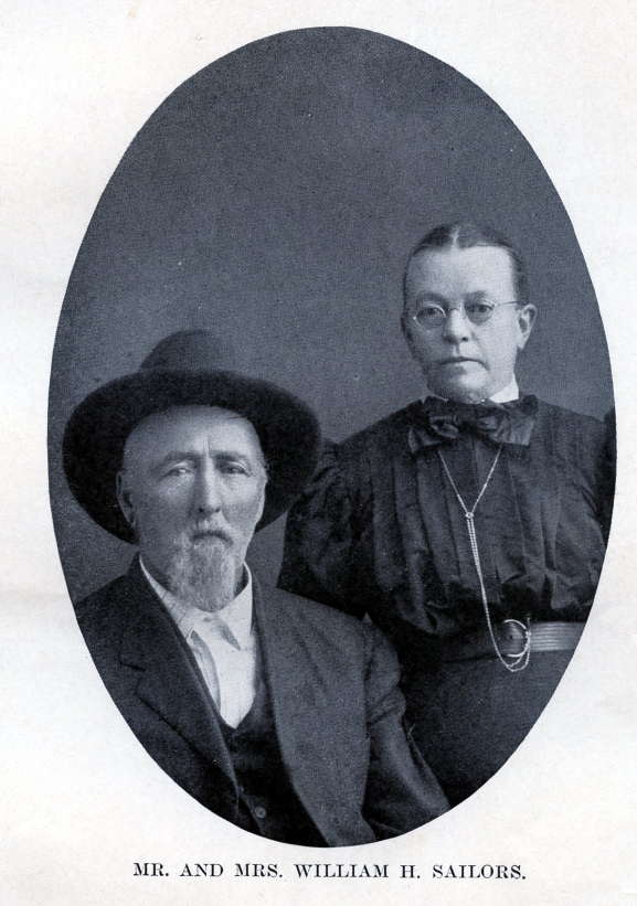 On October 25, 1860, in Grant county, Indiana, William H. Sailors was united in marriage to Mary E. Miller, who was horn in Fayette county, that same state, February 18, 1845, a daughter of George W. and Harriet (Bloomheart) Miller, the former a native of the state of Virginia and the latter of the state of New York, who had moved to Indiana with their respective parents in the days of their youth and had there grown up and married. George W. Miller was the son of Andrew and Elizabeth Miller, natives of Virginia, and his wife was the daughter of Daniel and Clarissa (Gilmore) Bloomheart, natives, respectively, of Holland and of the state of New York. George W. Miller was born on April 5, 1817, and died in 1903. His wife, also born in 1817, preceded him to the grave many years, her death having occurred in 1857.