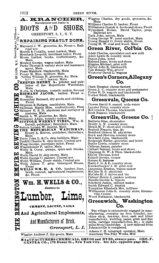 Benidge, J. P., stone quarry Hall, John, gluemaker Green River, Columbia County Page 1012 Adsit, Charles, speculator and saw mill Adsit, Lewis B., country store Dunce, John, hotel Halsted, Isaac, boots and shoes Higgins, Michael, grist mill Taylor, John E., blacksmith Van Heusen, Wm., grocer Westover, David L., wagons |