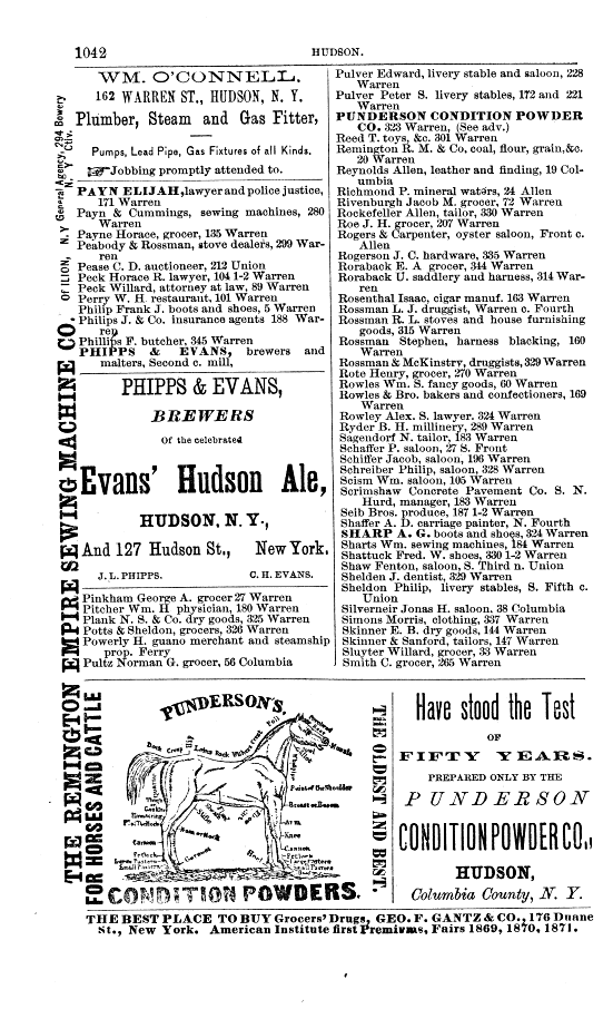 BOYD'S NEW YORK STATE DIRECTORY 1872-1873 FOR COLUMBIA COUNTY Hudson, Columbia Co. Page 1042 PAYN, ELIJAH, lawyer and police justice, 171 Warren Payn & Cummings, sewing machines, 280 Warren Payne, Horace, grocer, 135 Warren Peabody & Rossman, stove dealers, 299 Warren Pease, C. D., auctioneer, 213 Union Peck, Horace R., lawyer, 104 1-2 Warren Peck, W. H., restaurant, 101 Warren Philip, Frank J., boots and shoes, 5 Warren Philips, J. & Co., insurance agents, 188 Warren Phillips, F., butcher, 345 Warren PHIPPS & EVANS, brewers and malters, Second c. mill [see adv.] Pinkham, George A., grocer 27 Warren Pitcher, Wm. H., physician, 180 Warren Plank, N. S. & Co., dry goods, 325 Warren Powerly, H., guano merchant and steamship prop., Ferry Pultz, Norman G., grocer, 56 Columbia Pulver, Edward, livery stable and saloon, 228 Warren Pulver, Peter S., livery stables, 172 and 221 Warren PUNDERSON CONDITION POWDER CO., 323 Warren [see adv.] Reed, T., toys, &c., 301 Warren Remington, R. M. & Co., coal, flour, grain, &c., 20 Warren Reynolds, Allen, leather and finding, 19 Columbia Richmond, P., mineral waters, 24 Allen Rivenburgh, Jacob M., grocer, 72 Warren Rockefeller, Allen, tailor, 330 Warren Roe, J. H., grocer, 207 Warren Rogers & Carpenter, oyster saloon, Front c. Allen Rogerson, J. C., hardware, 335 Warren Roraback, E. A., grocer, 344 Warren Roraback, U., saddlery and harness, 314 Warren Rosenthal, Isaac, cigar manuf., 163 Warren Rossman, L. J., druggist, Warren c. Fourth Rossman, R. L., stoves and house furnishing goods, 315 Warren Rossman & McKinstry, druggist, 329 Warren Rote, Henry, grocer, 270 Warren Rowles, Wm. S., fancy goods, 60 Warren Rowles & Bro., bakers and confectioners, 169 Warren Rowley, Alex. S., lawyer, 324 Warren Ryder, B. H., millinery, 289 Warren Sagendorf, N., tailor, 183 Warren Schaffer, P., saloon, 27 S. Front Schiffer, Jacob, saloon, 196 Warren Schreiber, Philip, saloon, 328 Warren Scism, Wm., saloon, 105 Warren Scrimshaw Concrete Pavement Co., S. N. Hurd, manager, 183 Warren Seib Bros, produce, 187 1-2 Warren Shaffer, A. D., carriage painter, N. Fourth SHARP, A. G., boots and shoes, 324 Warren Sharts, Wm., sewing machines, 184 Warren Shattuck, Fred W., shoes, 330 1-2 Warren Shaw Fenton, saloon, S. Third n. Union Shelden, J., dentist, 329 Warren Sheldon, Philip, livery stables, S. Fifth c. Union Silverneir, Jonas H., saloon, 38 Columbia Simons, Morris, clothing, 337 Warren Skinner, E. B., dray goods, 144 Warren Skinner, & Sanford, tailors, 147 Warren Sluyter, Willard, grocer, 33 Warren Smith C., grocer, 265 Warren
