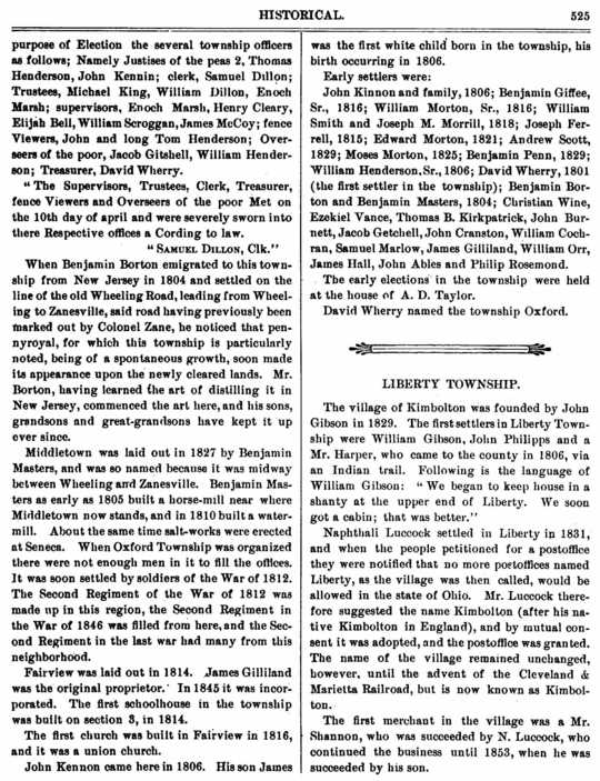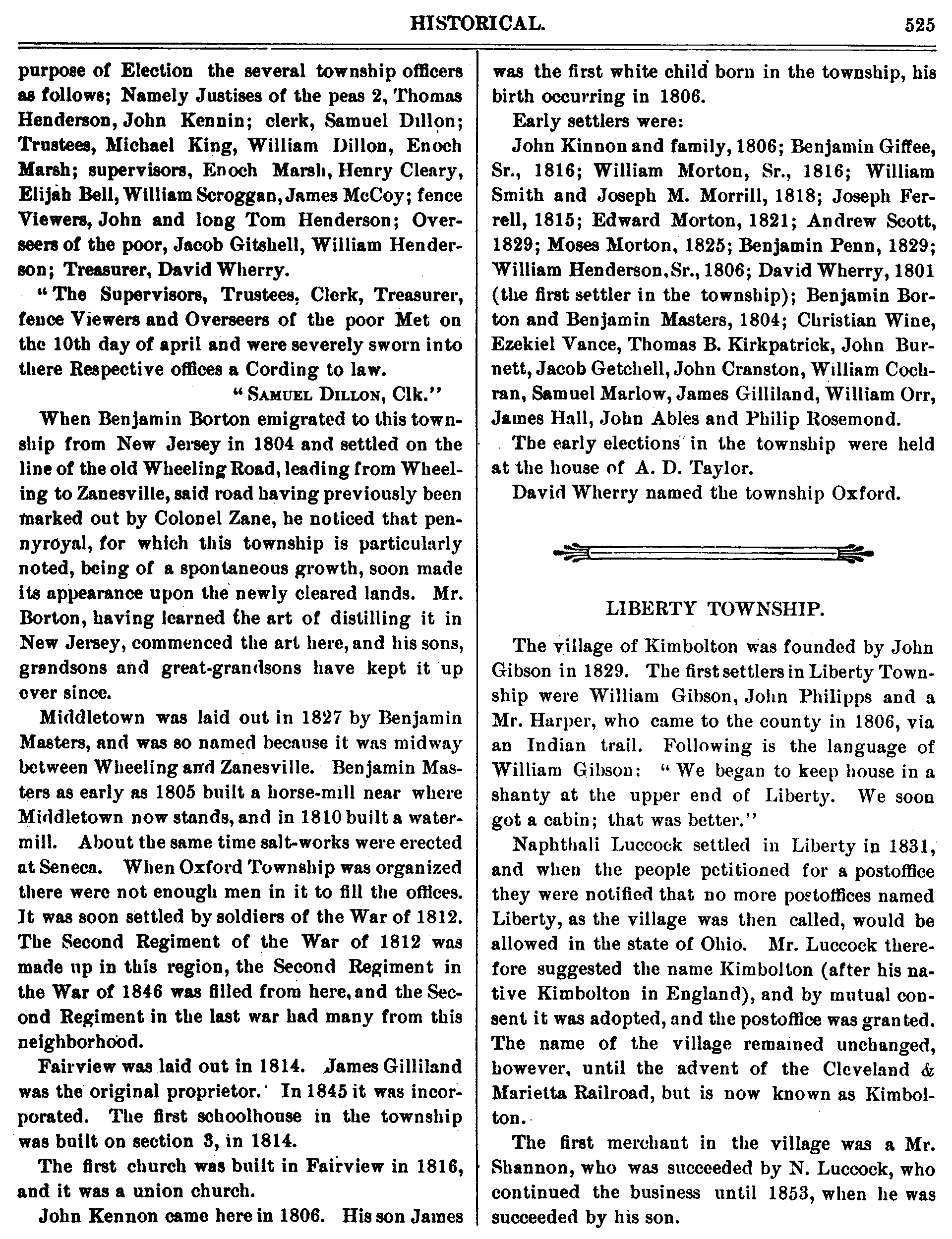 John Kinnon and family, 1806; Benjamin Giffee, Sr., 1816; William Morton, Sr. 1816; William Smith and Joseph M. Morrill, 1818; Joseph Ferrell, 1815; Edward Morton, 1821; Andrew Scott, 1829; Moses Morton, 1825; Benjamin Penn, 1829; William Henderson, Sr.,1806; David Wherry, 1801 (the first settler in the township); Benjamin Borton and Benjamin Masters, 1804; Christian Wine, Ezekiel Vance, Thomas B. Kirkpatrick, John Burnett, Jacob Getchell, John Cranston, William Cochran, Samuel Marlow, James Gilliland, William Orr, James Hall, John Ables and Philip Rosemond. The early elections in the township were held at the house of A. D. Taylor. David Wherry named the township Oxford. ->)====================(<- The village of Kimbolton was founded by John Gibson in 1829. The first settlers in Liberty Township were William Gibson, John Philipps and a Mr. Harper, who came to the county in 1806, via an Indian trail. Following is the language of William Gibson: " We began to keep house in a shanty at the upper end of Liberty. We soon got a cabin; that was better." Naphthali Luccock settled in Liberty in 1831, and when the people petitioned for a postoffice they were notified that no more postoffices named Liberty, as the village was then called, would be allowed in the state of Ohio. Mr. Luccock therefore suggested the name Kimbolton (after his native Kimbolton in England), and by mutual consent it was adopted, and the postoffice was granted. The name of the village remained unchanged, however, until the advent of the Cleveland & Marietta Railroad, but is now known as Kimbolton. The first merchant in the village was a Mr. Shannon, who was succeeded by N. Luccock, who continued the business until 1853, when he was succeeded by his son. |