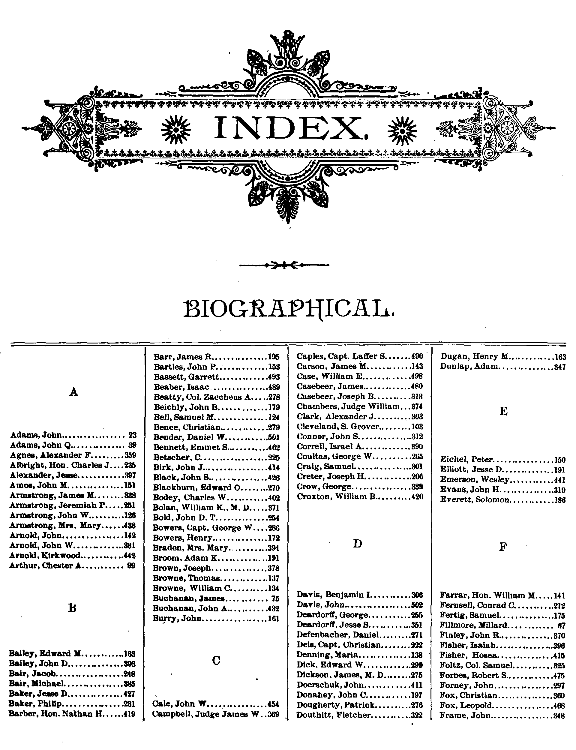 Caples, Capt. Laffer S.490 Carson, James M........143 Case, William E........498 Casebeer, James........480 Casebeer, Joseph B.....313 Chambers, Judge William .......................374 Clark, Alexander J.....303 Cleveland, S. Grover...103 Conner, John S.........312 Correll, Israel A......390 Coultas, George W......265 Craig, Samuel..........301 Creter, Joseph H.......206 Crow, George...........339 Croxton, William B.....420 D