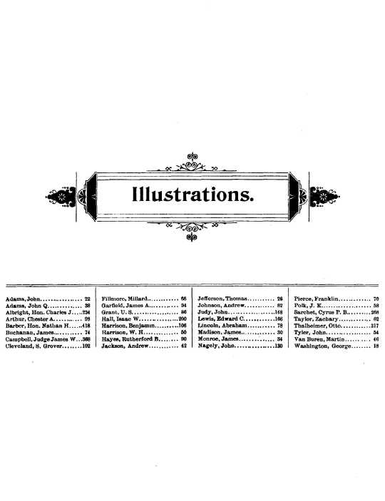 Fillmore, Millard.......66 Garfield, James A.......94 Grant, U. S.............86 Hall, Isaac W..........200 Harrison. Benjamin.....106 Harrison, W. H..........50 Hayes, Rutherford B.....90 Jackson, Andrew.........42 |