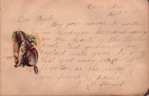 Dear PupilMay your name be written in kindness, love and mercy on the hearts of the thous-ands, that you come in contact with year by year, that you may never be forgotten, is the wish of you friend and teacher.