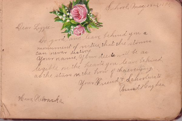 School, May 22nd, 1891 Dear Lizzie-Do good and leave behind you a monument of virtue, that the storms can never distroy Your name, your deeds will be as legible on the hearts you leave behind as the stars on the brow of the evening. Your Friend & Schoolmate Howe, Nebraska |