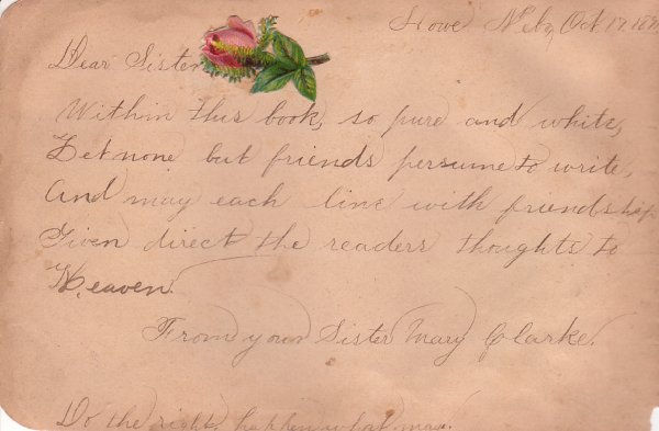 Within this book, so pure and white,Letnone but friends persume to write, And may each line with friendship Given direct the readers thoughts to Heaven.