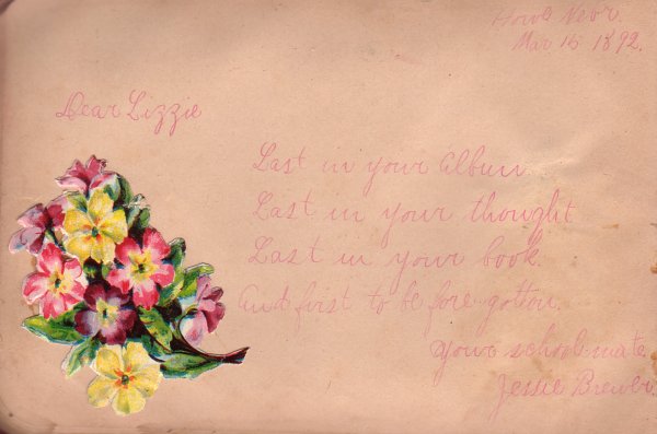 Dear LizzieLas in your AlbumLas in your thoughtLast in your bookAnd first to be fore gotton.