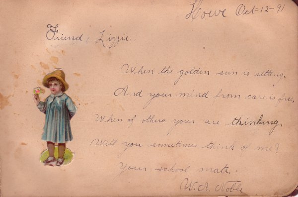 Friend Lizzie.When the golden sun is sitting,And your mind from care is free,When of others you are thinking,Will you sometimes think of me?Your school mate.W. A. Noble