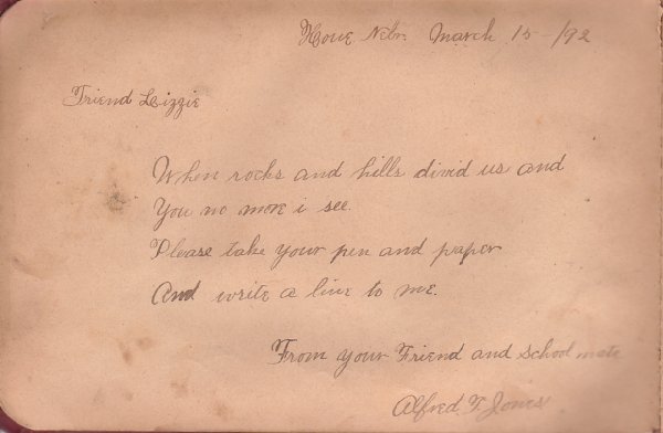 Friend Lizzie When rocks and hills divid us and You no more i see Please take your pen and paper And write a line to me.