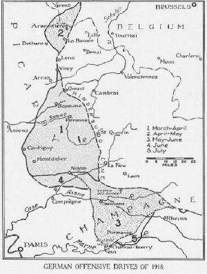 8. The next offensive of the enemy was made between the Oise and Berry-au-Bac against the French instead of against the British, as was generally expected, and it came as a complete surprise. The initial Aisne attack, covering a front of 35 kilometers, met with remarkable success, as the German armies advanced no less than 50 kilometers in four days. On reaching the Marne that river was used as a defensive flank and the German advance was directed toward Paris. During the
