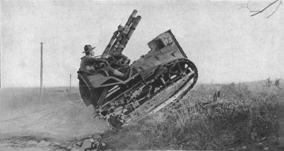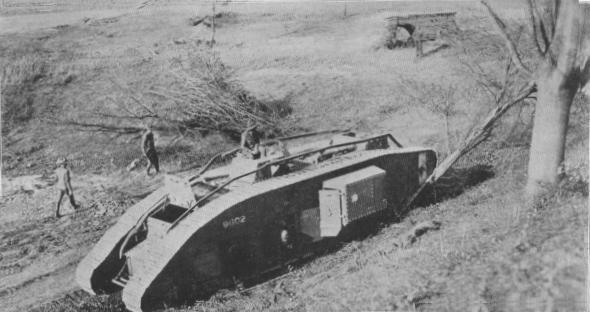 The British forces introduced the tank, much to the terror and confusion of the enemy. Here is seen a caterpillar-traction device in action, knocking down a 12-inch tree with the ease that a man's foot crushes a weed.