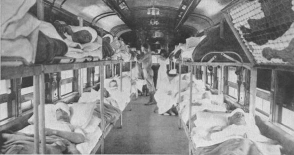 Medical Officers' Training Camp at Fort Riley, Kansas. These soldiers are not wounded but afford practical experience in the handling of wounded men on board Hospital Trains. Red Cross nurses are in attendance.