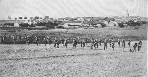 Training of the post-graduate type in France, (according to the text books). The picture shows an automatic rifle squad, with a scout, in correct position at an American military training camp near a provincial town in France.