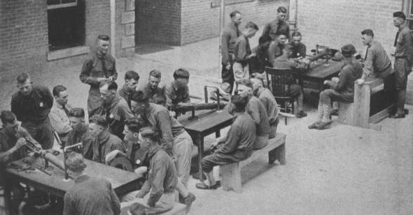 This photograph shows a class of army students being given a lesson in assembling the various parts of the Lewis machine gun. A graduate of this class could take a Lewis gun apart and reassemble it very speedily.