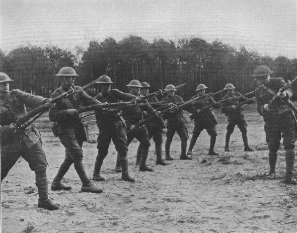 | FIX BAYONETSThe boys in the Infantry were thoroughly instructed in the manipulation of the bayonet before they were sent on to the front line trenches. This photograph shows members of the 2nd Battalion, 329th Infantry, 83rd Division, practicing with their bayonets at Le Mans, Sarthe, France.