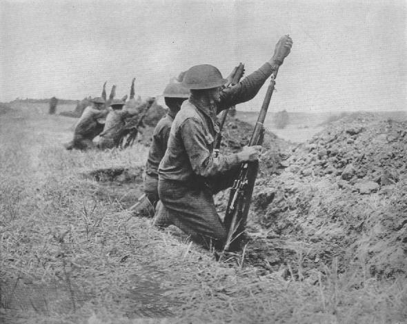 | NEW FANGLED GADGETSThese men of the 144th Infantry, 36th Div., are engaged in rifle grenade practice at the 13th Training Section, Ville-sur-Tierre, France. The rifle grenade is made to accomplish the same purpose as the hand grenade but it is fired from the gun in place of being thrown by hand.