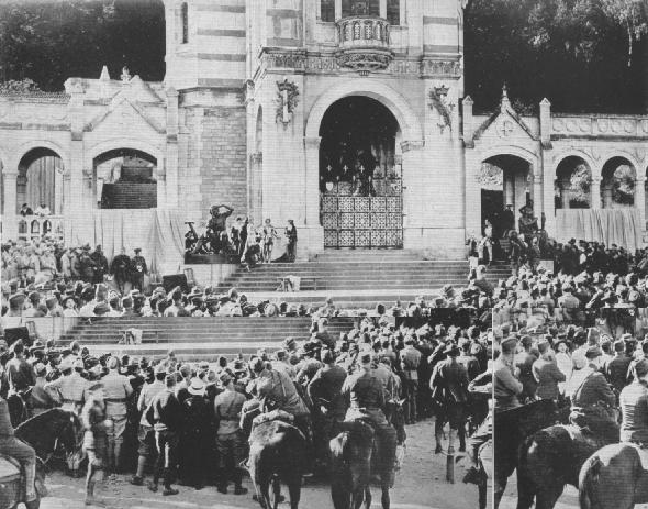 | THE MAID OF ORLEANSThis photograph was taken during scene four of the pageant "Jeanne d'Arc", which was presented for American soldiers by the Entertainment Section of the Y. M. C. A. in front of the Jeanne d'Arc church, near Domremy, France. The scene shows Jeanne in armor at Orleans.