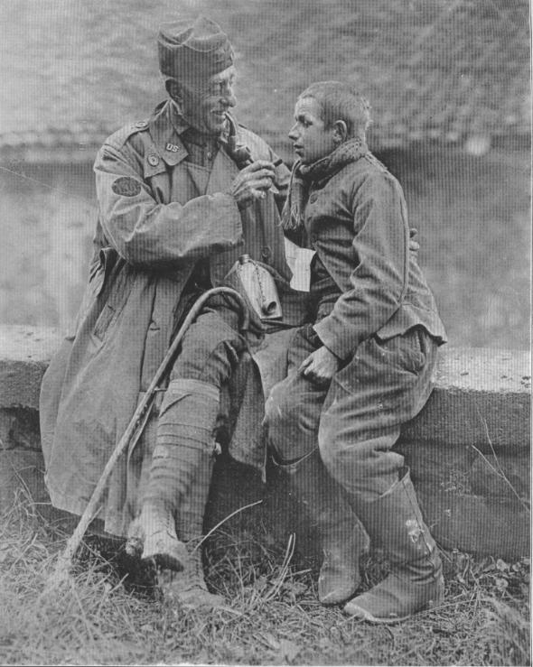 "Uncle Joe" (J. F. Kerman, Utica, New York), a Knights of Columbus worker, giving aid to Maria Chausson, a French refugee, who was injured in La Basace. St. Pierremont, Department of Ardennes, France, November 7, 1918.