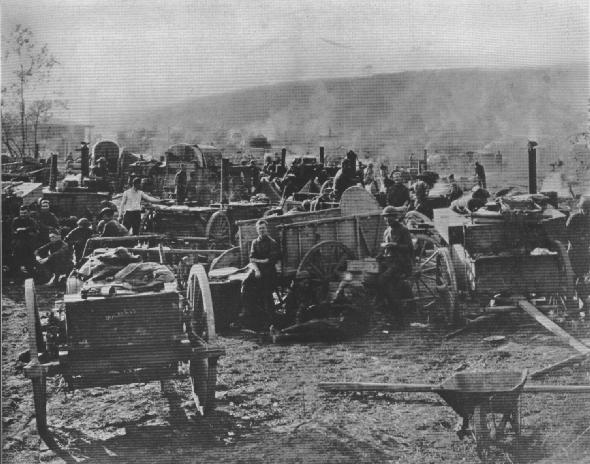 | THE KITCHENS MOVE UP--THIS MEANS ACTIONA concentration of rolling kitchens under the protection of the hill at Bouillonville, Department of Meurthe et Moselle, France. To the Yanks, Bouillonville was always known as "Souptown", the name which they gave the village when they arrived there for the first time.