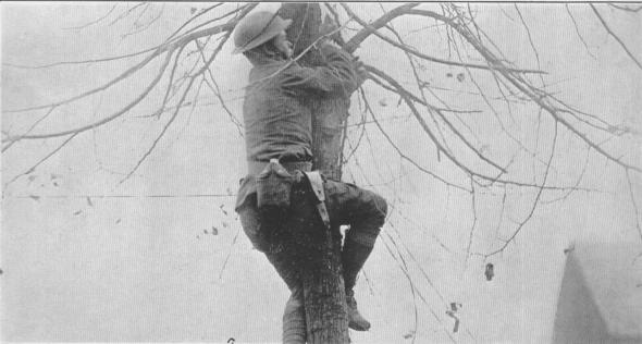 One of the tasks that fell to an American lineman, or signalman, on the Cambrai-St. Quentin front. This field telegraph expert, stringing wires on a "ready-made" telegraph pole near the front, is exposed to enemy fire.