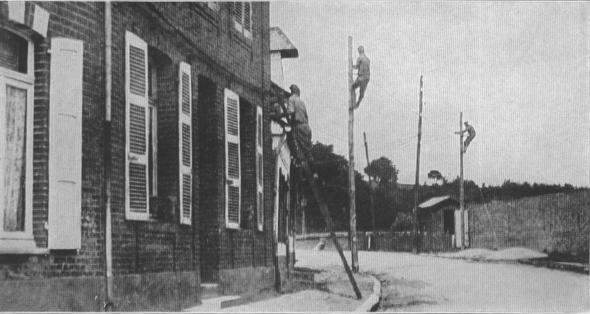 American Signal Corps men of Headquarters, Second Army Corps, stringing telephone and telegraph cables through an ancient French village. They did their work expertly, being the pick of their profession in the U. S. A.