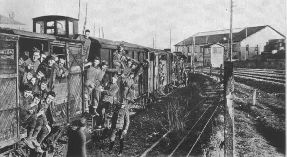 Forty Hommes--Eight Chevaus--Forty Men--Eight Horses--squeezed into French box cars. The men objected to such transportation but after they were packed in camions, they longed for the "comforts" of old Forty and Eight.