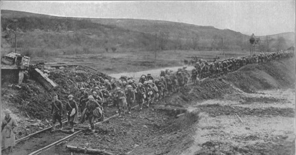 American infantry walking up the railroad track on its way to the front in France. There was many a bleak stretch of devastated country surrounding these men who traveled thousands of miles to defend America's honor and ideals.