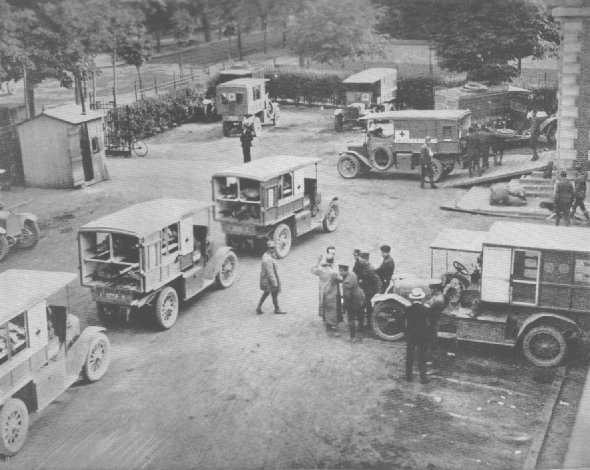 Here we see ambulances arriving with wounded American soldiers at an American field hospital in france. Many of our boys never came back.