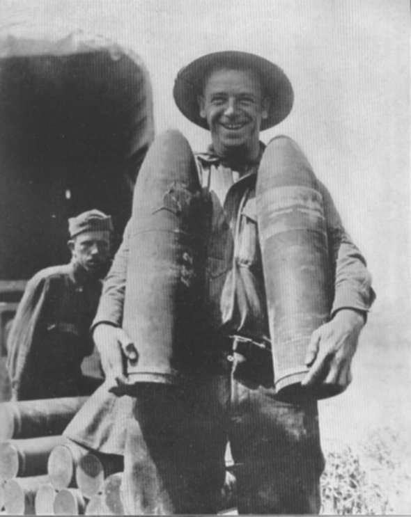 These are 155 mm. shells to be used by the big guns when they arrive at the Chateau-Thierry neighborhood. However, the Germans were pouring through and the American Division went into action before the heavy artillery arrived.