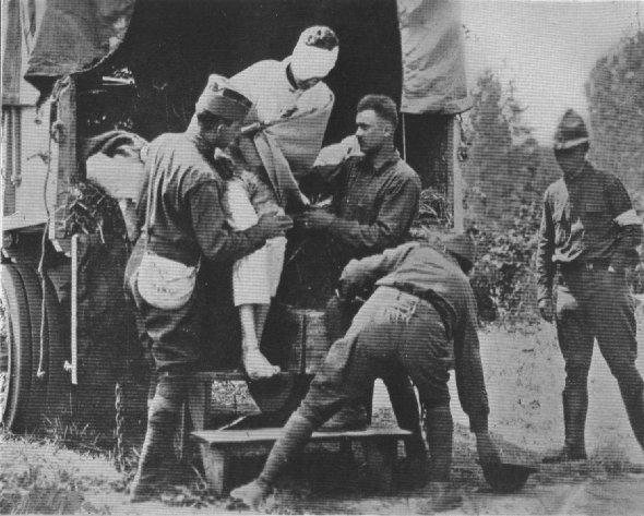 | THE GUESTS ARRIVEMarines, 4th Brigade, arriving at 15th Field Hospital, near Montreuil-aux-Lions. Wounded men did not seem to suffer much at first. The impulse of the attack and the shock from the missle, numb the nerves. Later, the pain becomes unbearable. Men break before reaching the hospitals.