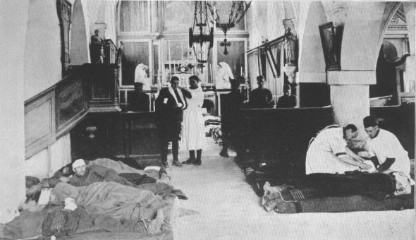 1st Field Hospital Unit of the 2nd Division at Bezu, France, June 16, 1918, in the interior of medieval church. Here men suffered and died, or lived in the constant and nerve-racking fear of bombs from enemy planes.