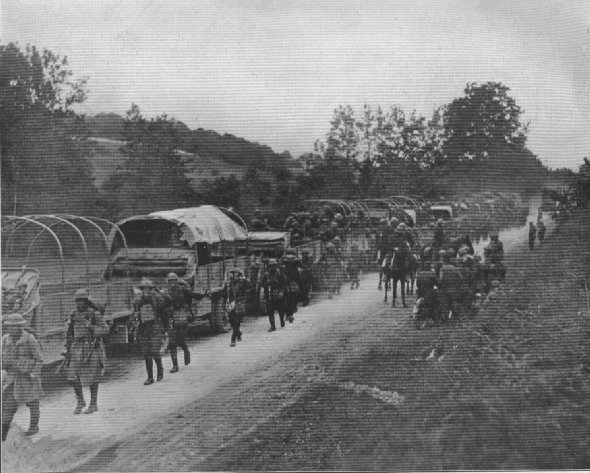 | MEN WALKED SILENTLY, REMEMBERING THE DEAD LEFT IN THE WOODSWhat remained of the 1st Battalion, 4th Brigade, 5th U. S. Marines, 2nd Div., after two replacements. After 38 days' attacking from Hill No. 142 on the left, through what the French now call Bois de la Brigade de Marine, to Vaux on the right, these men are now going back to rest camp.